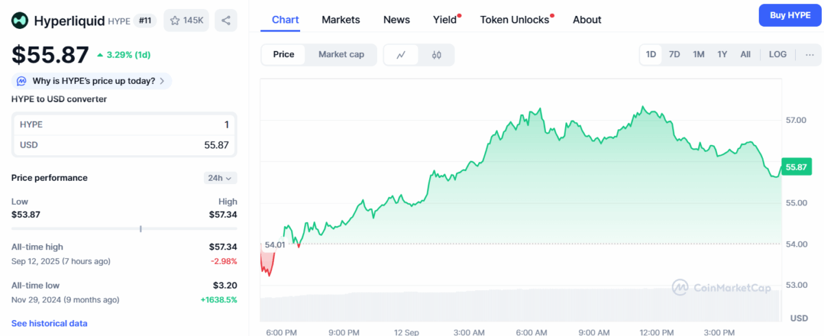数据显示,HYPE价格于9月12日达到57.34美元的新高。截至发稿时,该代币交易价格为56.47美元,较上周上涨近22%。其当前市值为186亿美元,24小时交易量达5.85亿美元。