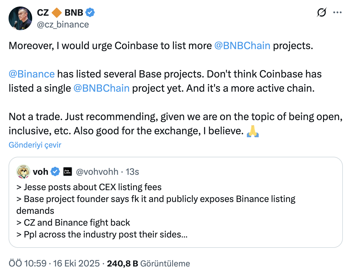 值得关注的是,就在赵长鹏发表声明数小时后,Coinbase于10月16日凌晨宣布已将BNB代币列入官方上币路线图。这一进展重新引发市场对两大交易所巨头竞争关系的讨论。历史数据显示,Coinbase长期对BNB生态系统保持疏离态度。此次上币计划可能标志着其在与BNBChain等竞争公链建立合作关系方面迈出关键一步,同时继续推进Base网络的发展。
