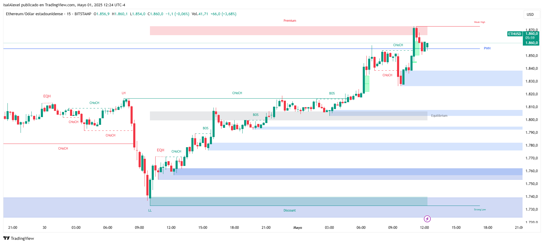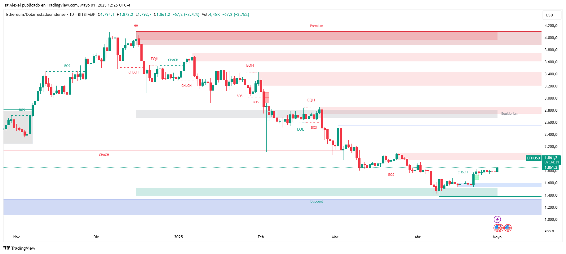 从技术角度来看,ETH目前交易价格在1750美元至1850美元之间。突破1850美元可能会引发向2000-2100美元的反弹,特别是在成交量强劲和需求持续的情况下。