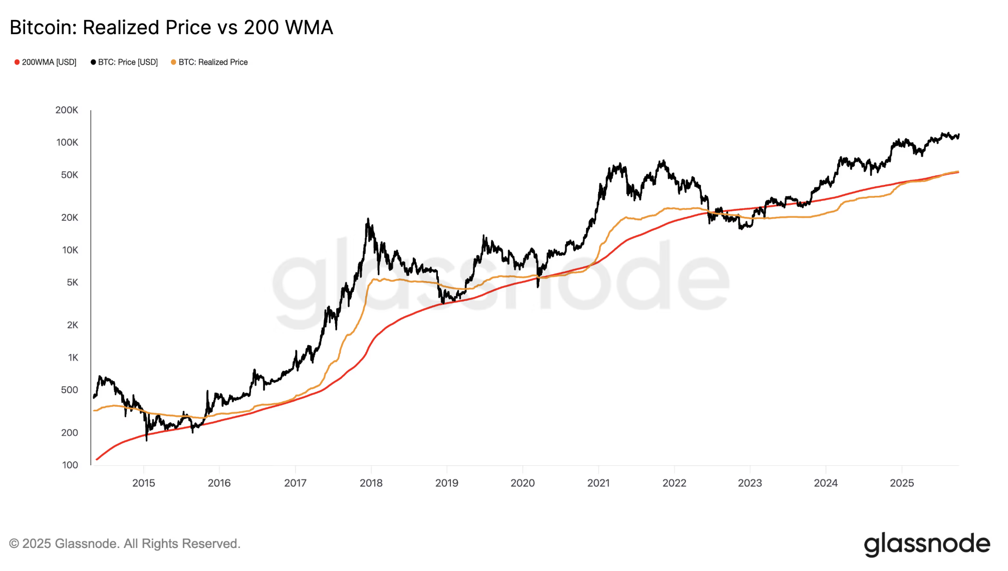 尽管市场存在周期结束的论调,比特币的长期指标仍表明上升趋势将持续。10月初,200周移动平均线(WMA)突破53,000美元关口,而代表区块链内平均成本的实现价格则攀升至54,000美元。虽然市场普遍将每年最后一季度视为"峰值期",但历史数据显示,这两项指标的双双达标往往与牛市初期阶段吻合,暗示价格大概率维持上行轨迹。加密货币市场决策者面临的核心问题是:实现价格能否持续站稳200周均线上方。