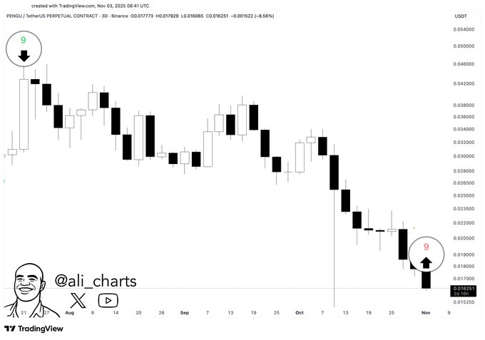 TD Sequential指标为$PENGU触发了"9"买入信号,暗示持续两个月的下跌趋势可能接近尾声。该代币从8月初0.06美元高位持续滑落,当前已逼近0.016美元关键支撑位。分析师Ali(@ali_charts)指出,三日周期的TD序列计数通常出现在市场底部区域,往往预示着短期反弹或盘整阶段的到来。蜡烛图波动幅度逐渐收窄,也显示空头压制力度正在减弱。