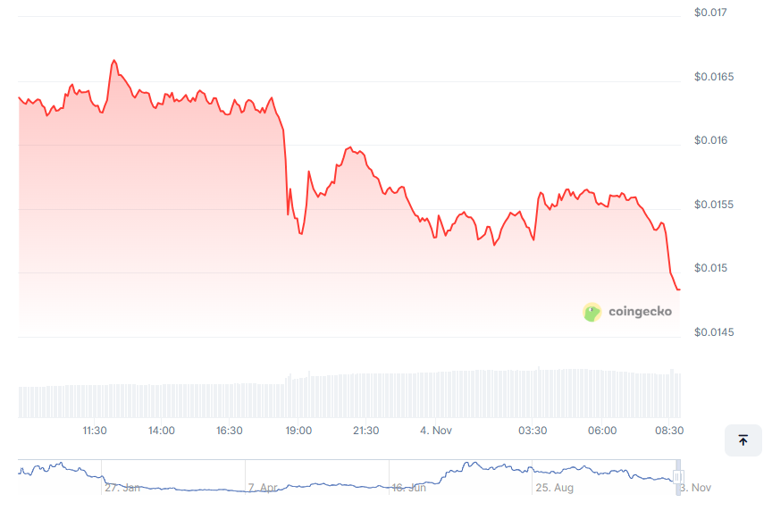 日内图表显示价格从0.0164美元回落至0.0149美元,证实TD信号未能立即扭转颓势。但高低点逐步收窄的形态,暗示多头正尝试在关键支撑位构筑防线。