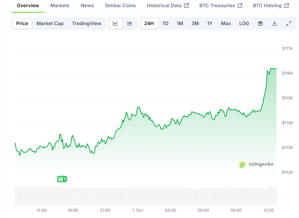 最新数据显示,比特币现报116,243美元,24小时交易量达614亿美元,日内涨幅2.63%。周线录得3.28%的涨幅,为十月行情积蓄了初步动能。