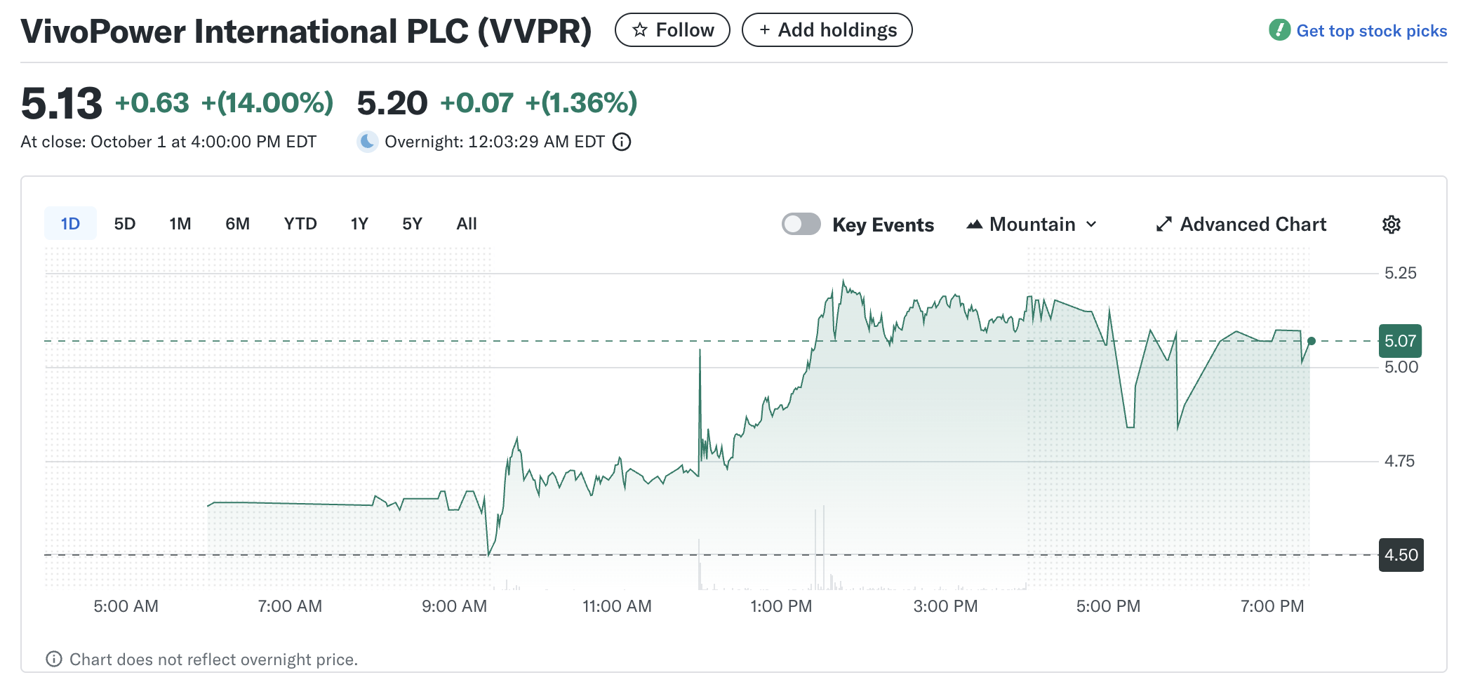 根据雅虎财经数据,VivoPower股票最近交易日收涨14%报5.13美元,盘前交易中续涨1.36%至5.20美元。
