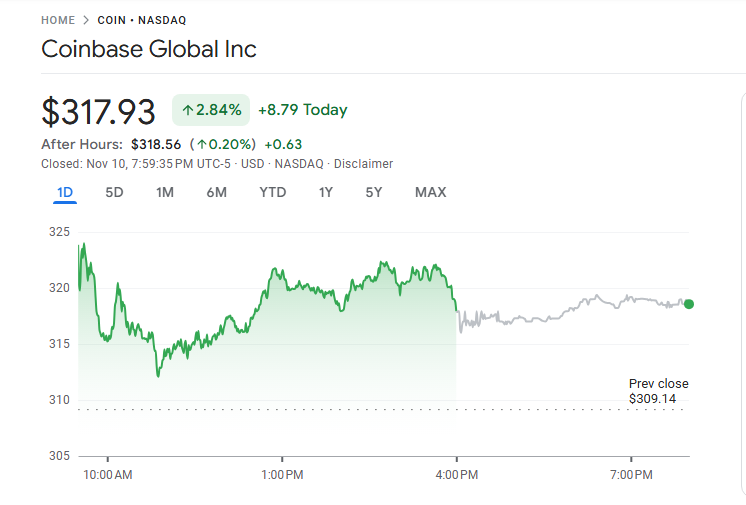 周一COIN股价收于317.93美元,单日涨幅约2.8%,创10月下旬以来最大单日涨幅。盘前交易时段受消息刺激一度跳涨4%。当日成交量约900万股,接近30日均值,显示投资者兴趣浓厚。
