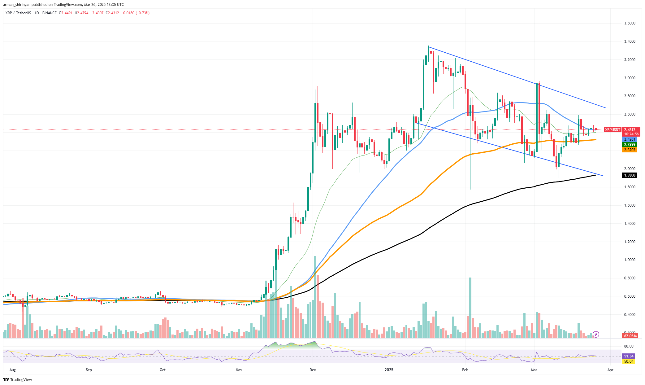 自年初高点以来,XRP的上涨一直受到下降趋势线的压制,该趋势线定义了当前阻力位。然而,这一趋势线一直在稳步下降,目前位于约2.60美元。