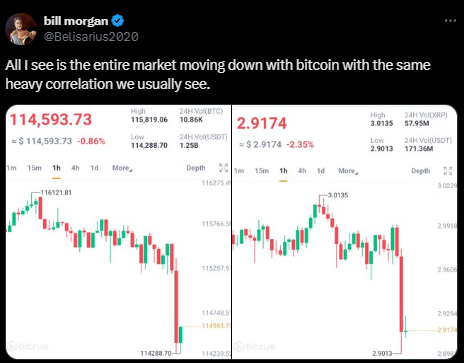 XRP此次下跌源于上周短暂突破3.10美元后的获利回吐。比特币(BTC)同期跌破115,000美元关口,拖累整个加密市场情绪。