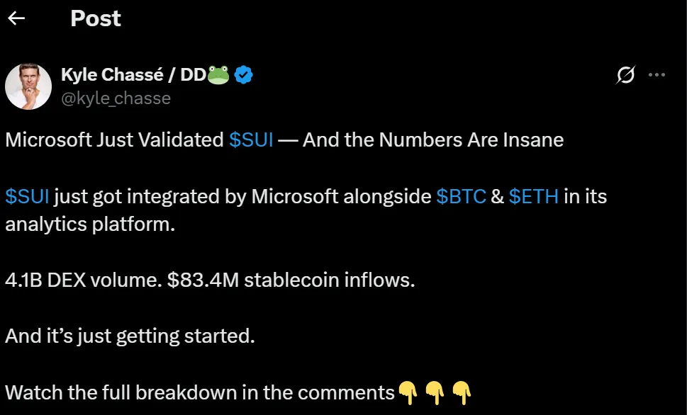 随着微软在其分析平台将SUI与比特币、以太坊并列集成,该代币本周迅速成为焦点。Kyle Chassé在X平台上披露这一更新,强调此举印证了SUI在区块链生态中日益重要的角色。
