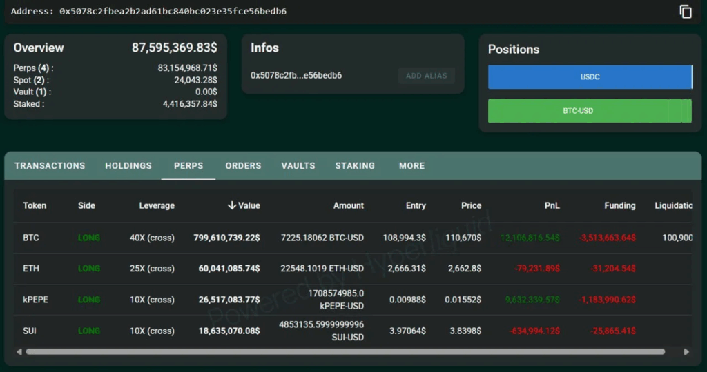 该巨鲸以25倍杠杆建立6000万美元以太坊多头,同时以10倍杠杆持有1800万美元SUI仓位。此类操作暗示其对山寨币短期内跑赢比特币的战术判断,尤其在市场资金正从大盘代币流向中市值项目的背景下。