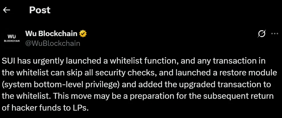 与此同时,SUI开发团队推出的协议层安全更新引发争议。据吴区块链报道,SUI新增白名单功能允许特定交易绕过所有安全检查。