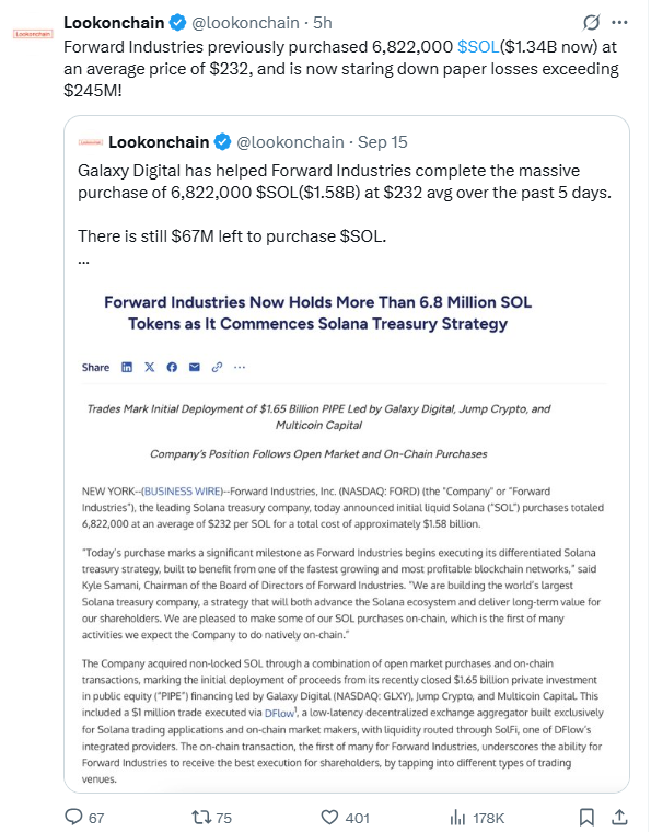 Forward Industries持有的巨额Solana资产正在快速贬值。该公司本周初以均价232美元购入了6,822,000枚SOL,总交易金额约15.8亿美元,意图打造其高管宣称的"全球最大Solana储备公司"。然而根据最新行情,SOL价格已跌至194美元,意味着该公司持仓价值缩水约2.45亿美元。