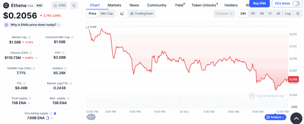 引发ENA转入币安的主要原因是价格下跌。截至撰稿时,该代币24小时内下跌3.74%,现报0.2056美元,24小时交易量下滑6.69%。