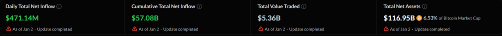 根据SoSoValue数据,比特币现货交易所交易基金(ETF)在新年首日表现亮眼,实现4.7114亿美元净流入。随着比特币攀升至90,925美元高点,净资产规模增长超30亿美元,达到1160亿美元,当日收盘价略低于90,000美元。