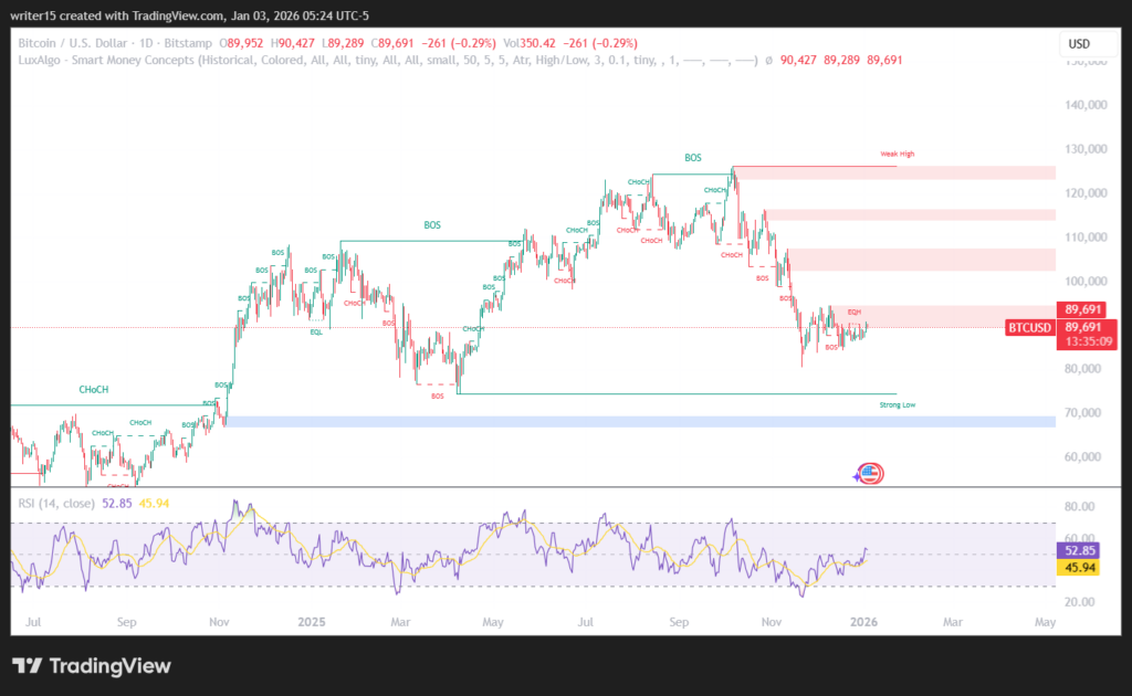 截至发稿,BTC交易价格为89,700美元,日内微跌0.1%,周涨幅达2%。当前90,925美元既是2026年最高位,也是自12月12日(当日盘中高点92,757美元)以来的峰值。
