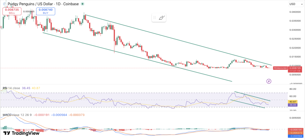 最新数据显示,PENGU的相对强弱指数(RSI)目前位于36.45。该水平表明加密货币正接近超卖区域,可能引发价格反弹。随着RSI逼近该阈值,许多交易者预期市场将迎来买盘压力,可能扭转下跌趋势。