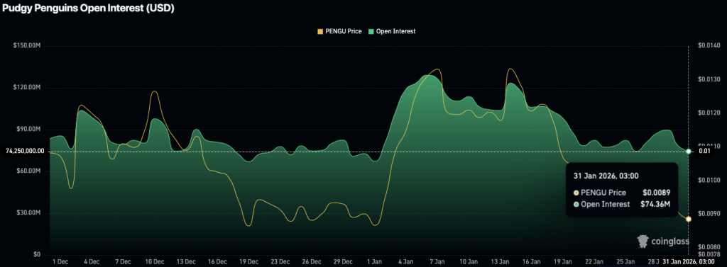 除当前价格表现外,PENGU的未平仓合约量已下降至7436万美元,表明在经历了十二月至一月初的波动期后,市场活动正在降温。未平仓合约的减少意味着建仓交易者数量下降,这可能是当前价格疲软的原因之一。