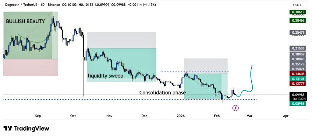 在经历深度流动性扫荡后,狗狗币正测试一个关键支撑位。若该支撑得以维持,价格可能迎来向0.14至0.18美元区间的反弹性回升。