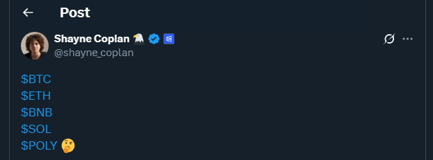 这位26岁创始人仅发布了"$BTC, $ETH, $BNB, $SOL, $POLY"九个字符的贴文,未作任何补充说明。其中"$POLY"的微妙出现迅速引发关注,