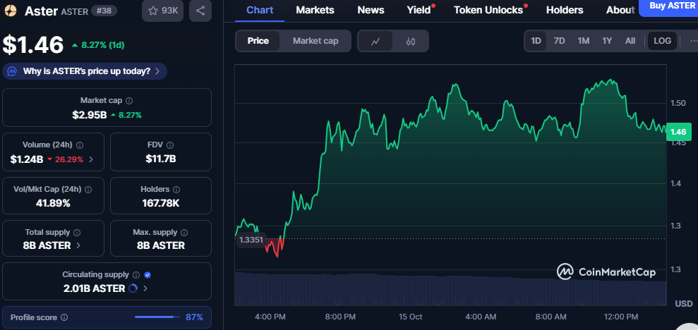 过去24小时内Aster涨幅超8%,主要交易所买盘增强推动价格升至1.46美元。该代币在1.33美元附近完成筑底后重启升势,显示市场不确定性周期后的需求复苏。尽管交易量收缩,其稳定增长态势强化了短期潜力预期。