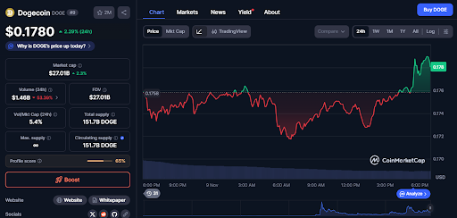 最新数据显示,狗狗币现报0.1780美元,24小时涨幅2.29%。市值单日增长2.3%至270.1亿美元,但24小时交易量却大幅萎缩53.39%至14.6亿美元,表明价格上涨过程中短期交易活跃度降低。