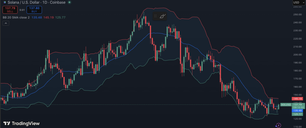 截至撰稿时,Solana正在测试135美元支撑区域,24小时交易量超过51.7亿美元。虽然该加密货币在过去24小时内上涨6.21%,但市场观察者仍保持谨慎态度。随着SOL价格徘徊在布林带指标下轨附近,市场似乎正处于波动加剧的阶段。
