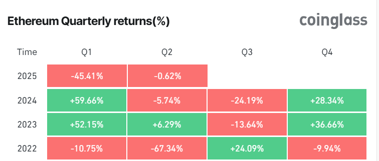 与此同时,ETH价格在2025年第一季度下跌超过45%,创下自2022年以来最差的季度表现。