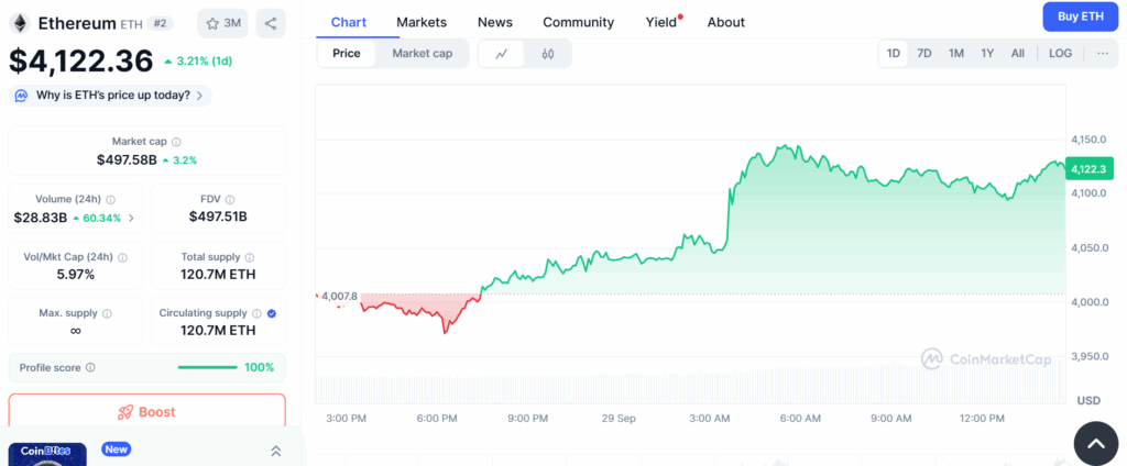 当前以太坊代币价格为4,122.36美元,24小时上涨3.21%。但过去7天和30天仍分别下跌1.16%和5.78%。24小时交易量增长60.34%,达到约288.3亿美元。从