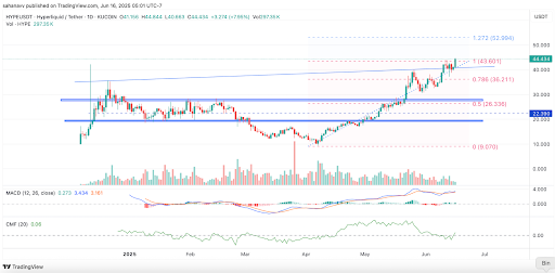本周交易伊始,市场展现看涨势头,Hyperliquid代币价格快速攀升至44.76美元历史高位。过去七天该代币持续走高,累计涨幅超25%。市场情绪显示涨势或将延续,交易者对HYPE未来走势表现出强烈乐观预期。技术面与图表形态均表明,该代币可能长期处于价格探索阶段。