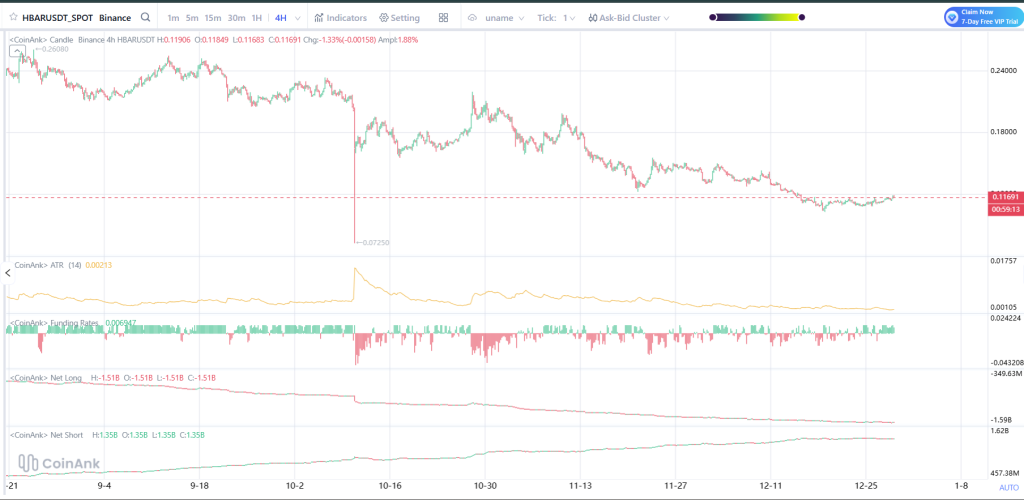 在4小时图表中,下跌趋势依然主导市场。自10月破位下跌以来,HBAR价格始终未能有效回升,过去数月的每次反弹均遭遇抛压。当前币价在0.115至0.117美元区间震荡,该支撑区域已坚守数日,但买方并未展现迫切入场意愿。逐渐缩小的K线实体通常预示市场处于盘整阶段而非趋势反转。
