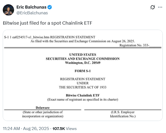 Bitwise向美国证券交易委员会(SEC)提交了Chainlink ETF的S-1申请,以完善其加密ETF布局。