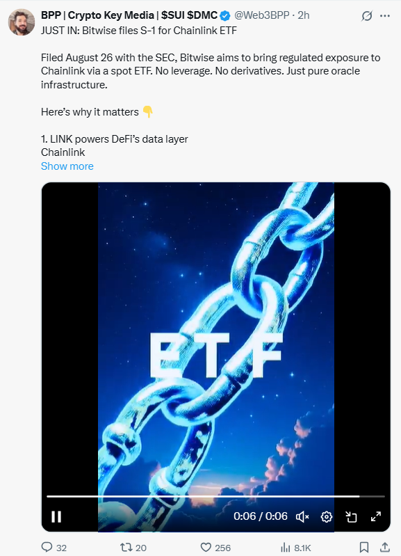 Bitwise资产管理公司已向SEC提交S-1注册声明,拟推出Chainlink ETF。这是首次尝试将预言机网络原生代币纳入监管框架的重要举措。包括Eric Balchunas在内的分析师指出,此举可能成为该资产乃至整个加密市场的里程碑事件。