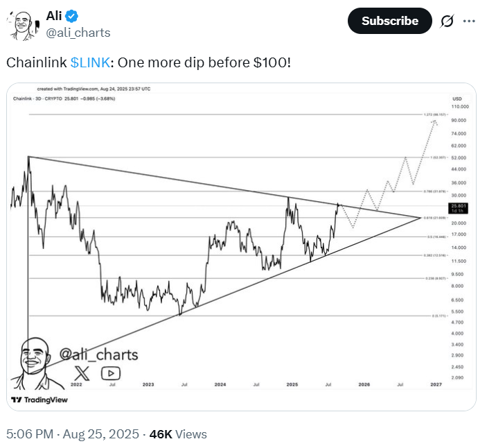 该ETF申请引发了对LINK价格走势的热议。市场分析师Ali Martinez认为LINK可能在上涨前经历最后一跌,这与先前预测相符。他在推特分享的图表显示LINK长期处于整理形态,未来可能出现突破。