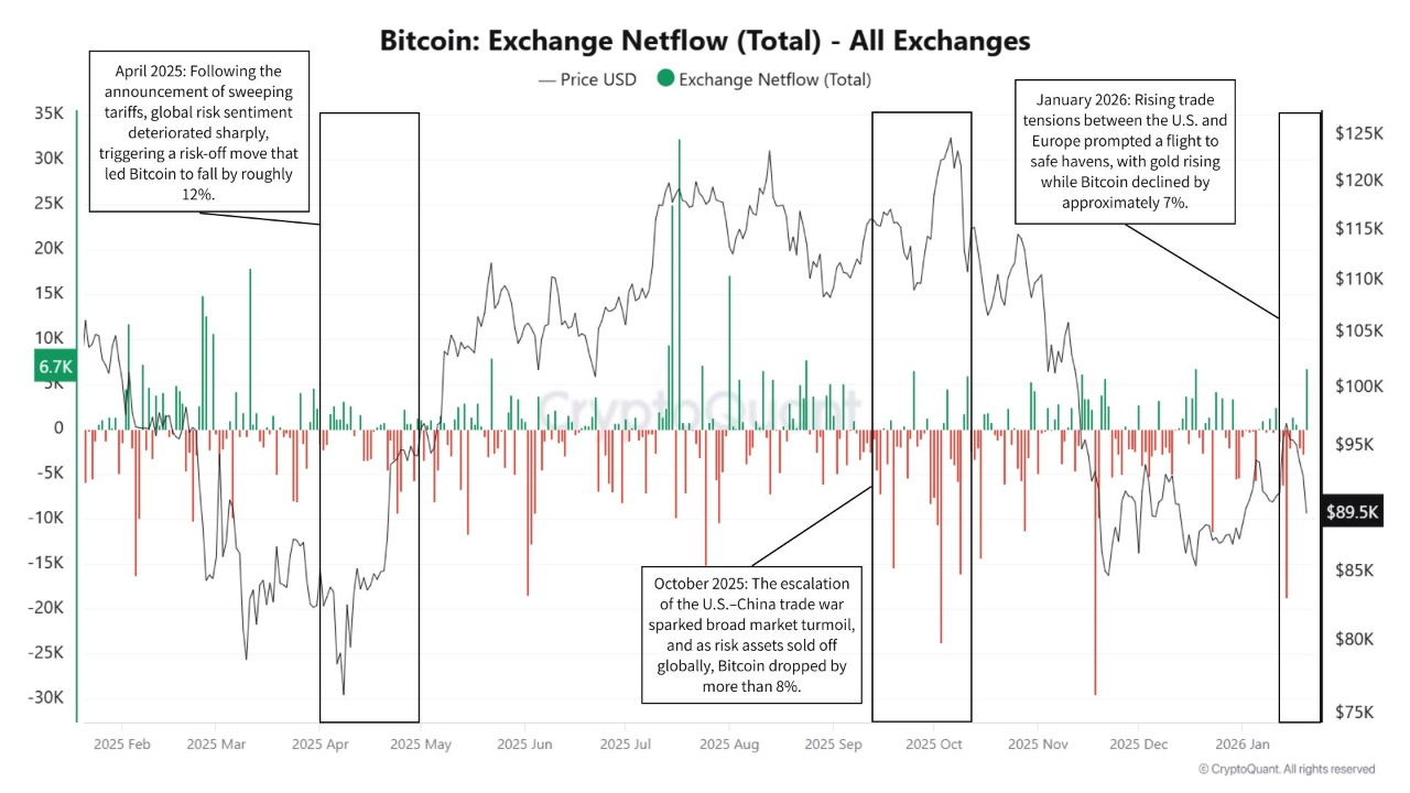 交易所净流入数据为理解近期比特币在回调阶段的价格走势提供了有用的背景。在经济不确定性加剧时期,交易所流入量会出现暂时性增加,这表明是战术性的仓位调整,而非恐慌性抛售。然而,这些流入激增是短暂的,并未演变成持续的抛售压力。