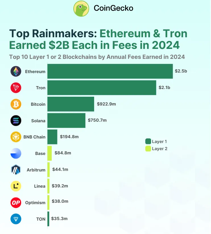 根据CoinGecko的数据,以太坊在2024年产生24.8亿美元手续费收入,同比增长3.0%。报告指出:"尽管2024年3月的Dencun升级降低了L2交易成本,且用户持续从L1链迁移至L2扩容解决方案,但以太坊在手续费收入方面仍保持领先地位。"