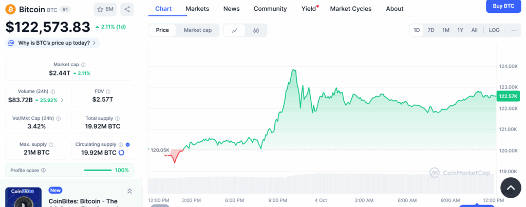 比特币24小时涨幅达2.11%,现报122,573.83美元,周涨幅11.73%。