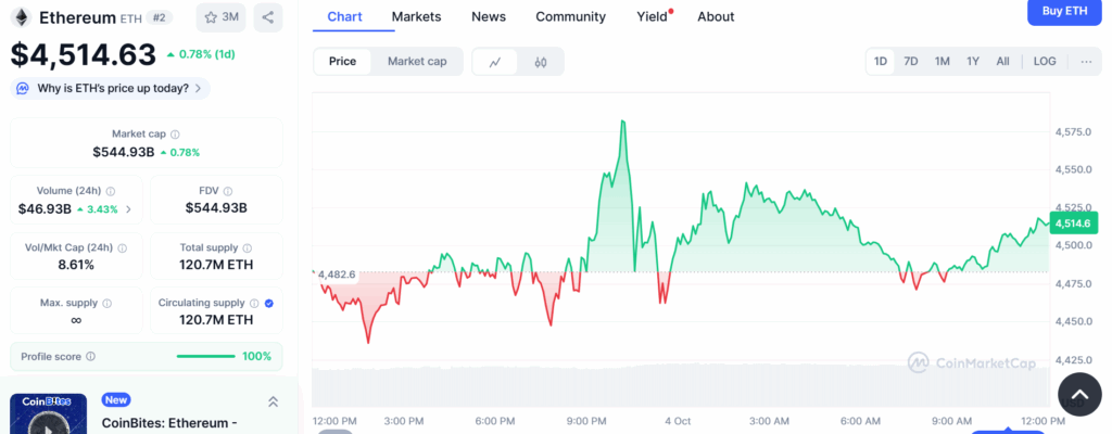 以太坊同期上涨0.78%至4,514.63美元,周涨幅12.12%(超越比特币)。