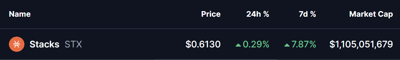 近期回调中,STX在触及楔形上沿阻力后回落至0.5550美元附近。但买方成功守住这一关键支撑位,推动代币反弹至0.6123美元,逐步逼近楔形阻力趋势线。