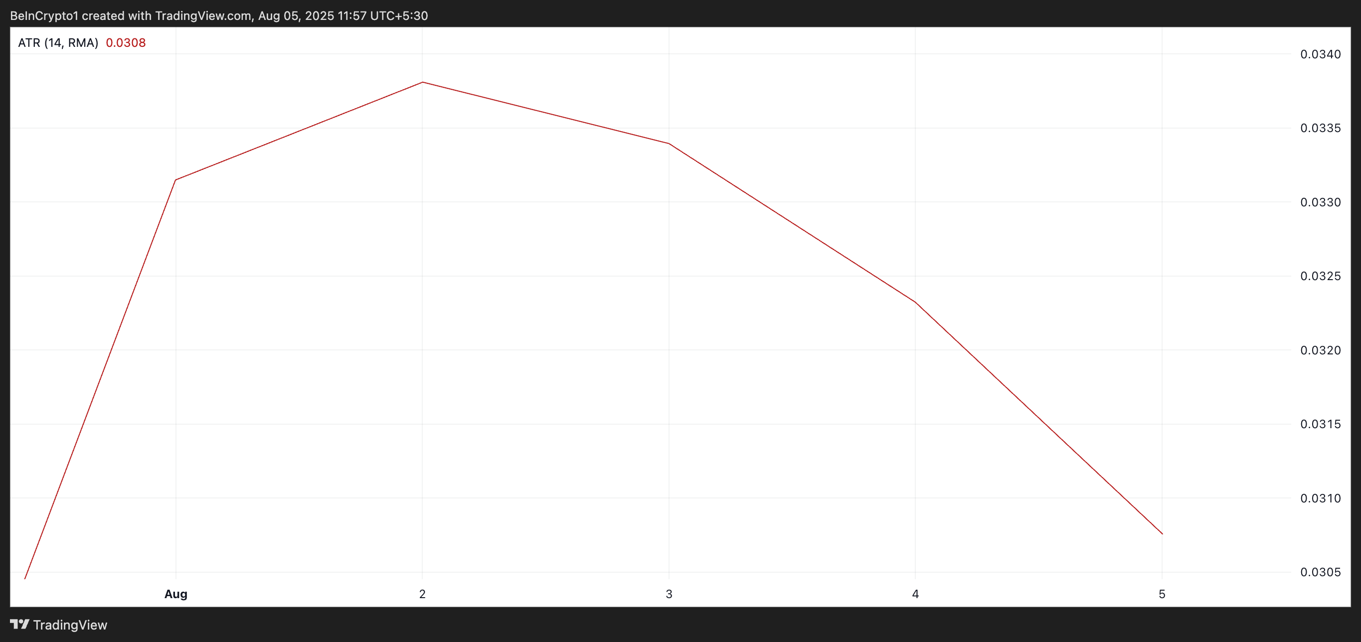 ATR指标用于衡量特定时间段内的价格波动程度。当该指标呈现当前这种下降趋势时,表明价格波动幅度正在减小,波动频率也在降低。与PI当前情况类似,这种走势通常出现在市场横盘整理阶段,交易者正在等待突破时机的到来。
