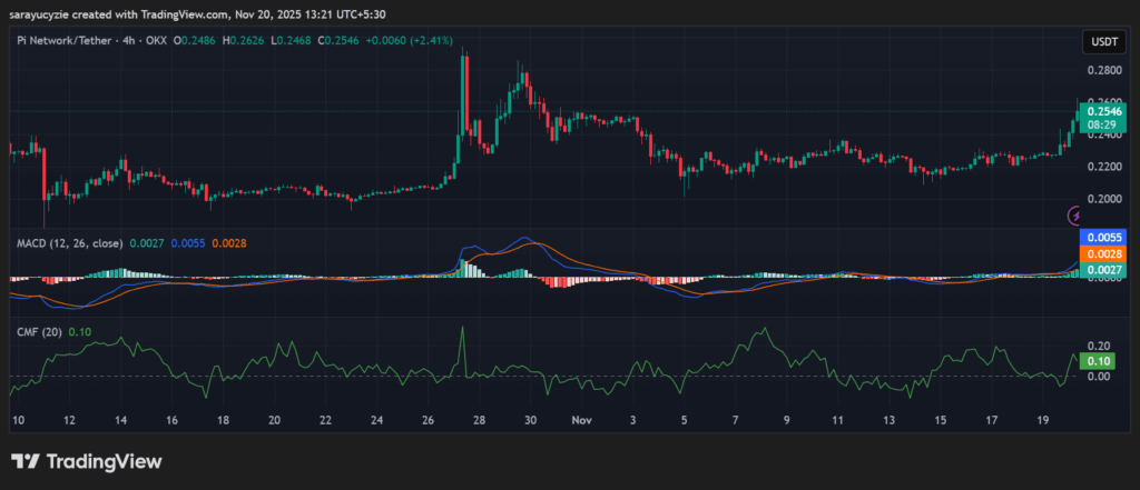 截至11月20日,加密货币市场呈现涨跌互现格局。在BTC和ETH下行之际,PI逆势暴涨9.84%,日内交易量激增超300%。该资产开盘报0.2261美元低点,随后多头力量推动价格攀升至0.2609美元高位,并成功突破0.2266-0.2604美元关键阻力区。