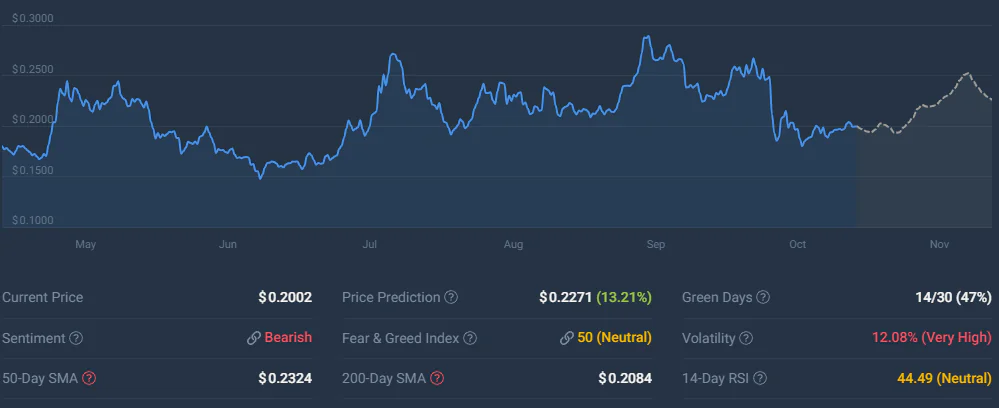 CoinCodex的模型显示,若当前条件保持不变,2025年DOGE交易区间约为0.191至0.249美元。