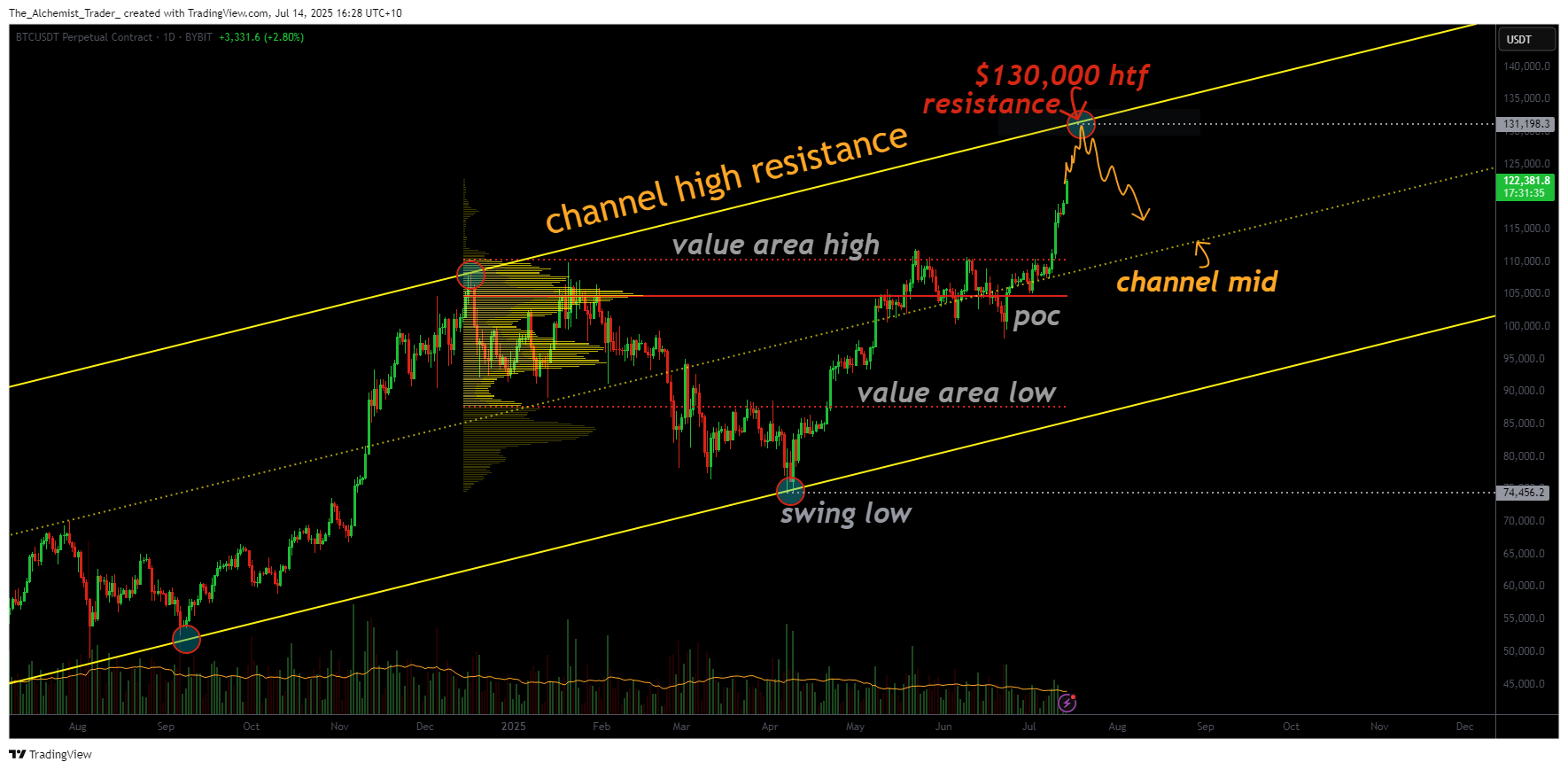 从宏观时间框架观察,比特币持续遵循明确上升通道的边界规律。此前通道下轨在回调中屡次形成支撑,而目前位于13万美元附近的通道上轨则历来扮演强劲阻力角色。价格现居于通道中轨支撑上方,表明多头仍掌控着市场动能。