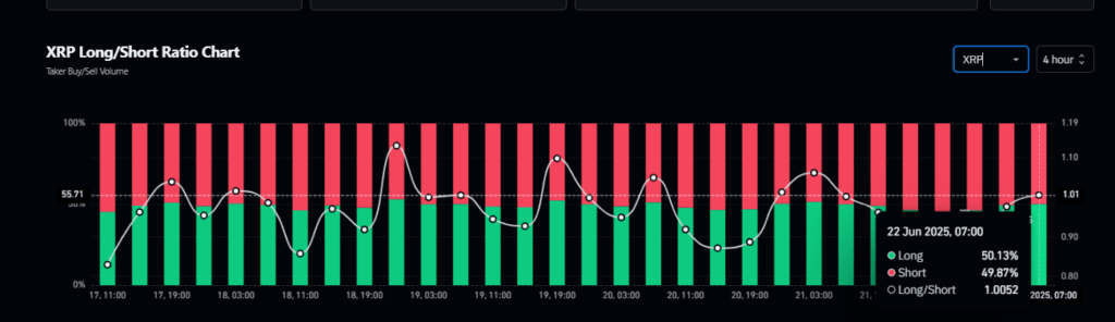 Coinglass数据显示,6月22日凌晨XRP多空比为1.005(多头50.13%/空头49.87%),表明市场方向未明。