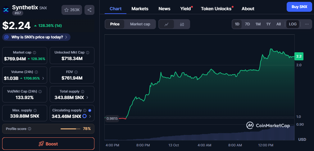 SNX 24小时暴涨128%突破2美元,创本周最强市场表现之一