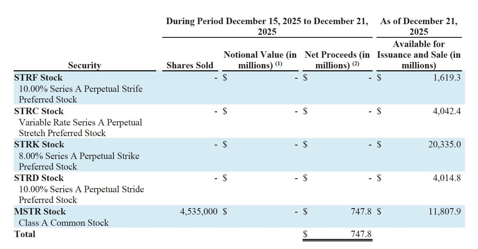监管文件显示,Strategy在12月15日至21日期间出售了453.5万股A类普通股,通过市场发行计划获得了7.478亿美元的净收益。该公司在此期间未出售任何优先股。