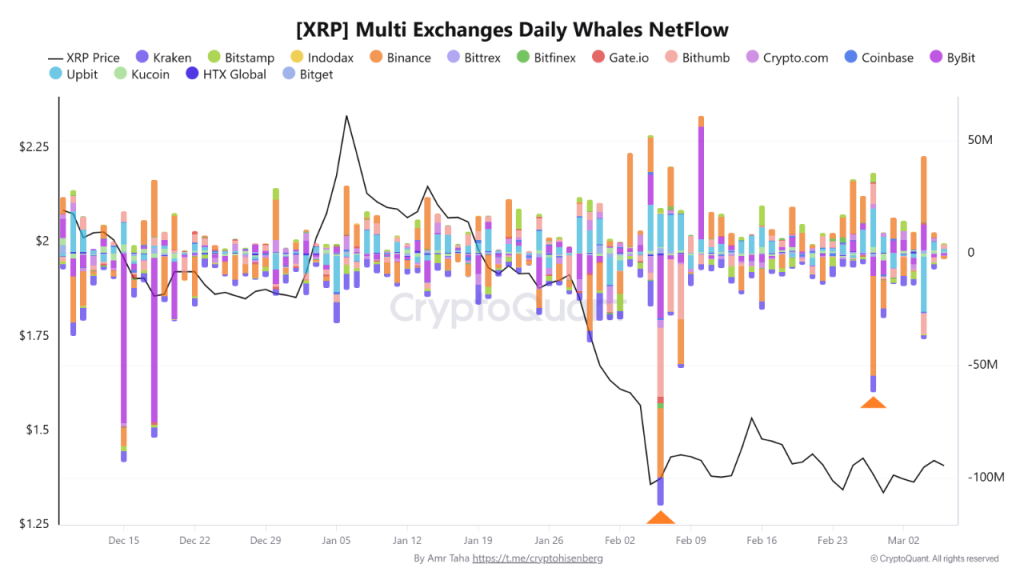 追踪鲸鱼行为常能揭示重大市场参与者在公众察觉前的动向。当前数据显示,瑞波币的净流出量出现急剧飙升。负向资金流意味着代币正离开交易所。分析师阿默尔·塔哈指出,2月27日约有4400万枚瑞波币从币安的鲸鱼钱包转出,这是数据集中可见的最大规模流出事件之一。而更早的2月6日亦出现类似动向:约3000万枚瑞波币从鲸鱼控制的钱包离开交易所。一月之内,同一交易所发生两笔巨额提现——这种模式很难被密切关注流动性的交易者忽视。