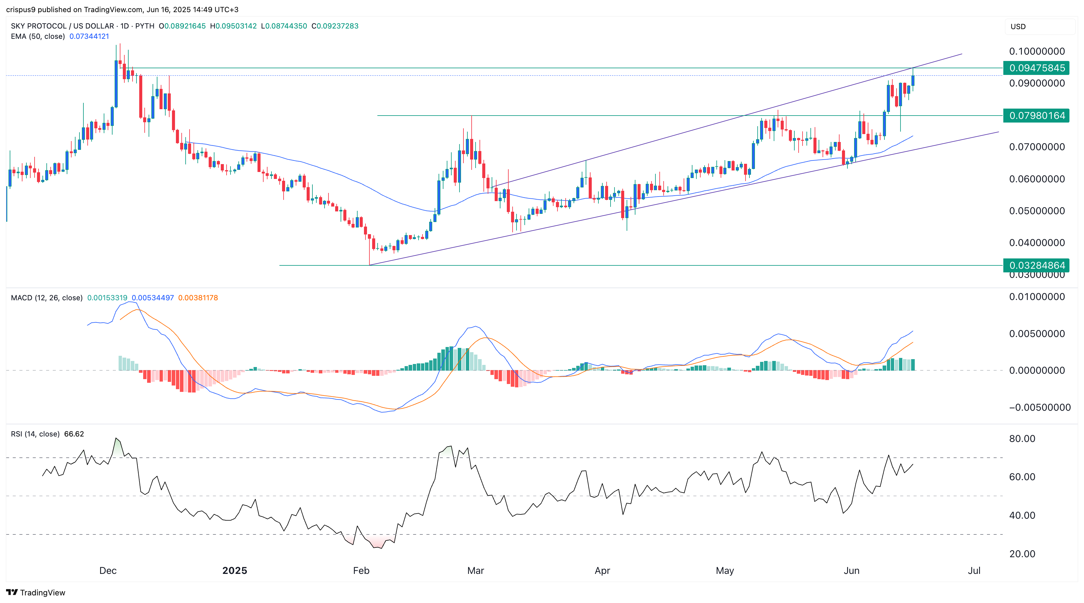 随着多数大型去中心化金融代币的集体上涨,Sky Protocol(SKY)在过去几个月实现显著回升。6月16日周一,SKY价格飙升至0.09475美元的年内高点,较今年最低点上涨190%,其市值随之突破19.5亿美元。