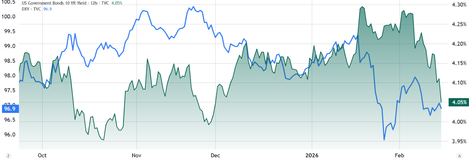 美国10年期国债收益率已跌至2025年11月以来的最低水平,表明此类债券的需求有所增加。这一趋势未必反映市场对美联储在不引发通胀的情况下避免衰退的策略信心增强。事实上,如美元指数所示,美元对一篮子外币汇率已走弱。