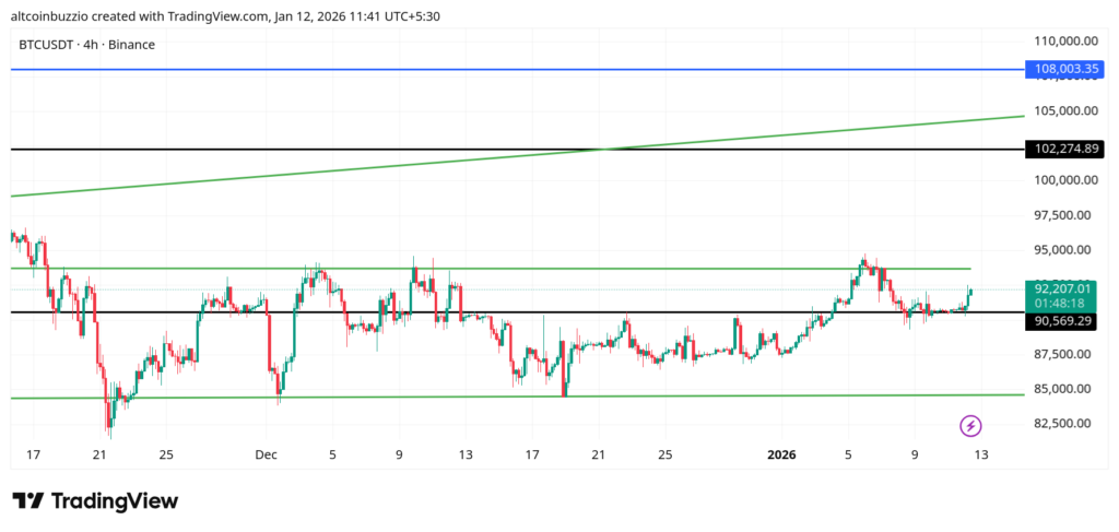关键反应区域位于91687.3美元和92127.9美元附近,这些区域对应图表上动能放缓的位置。