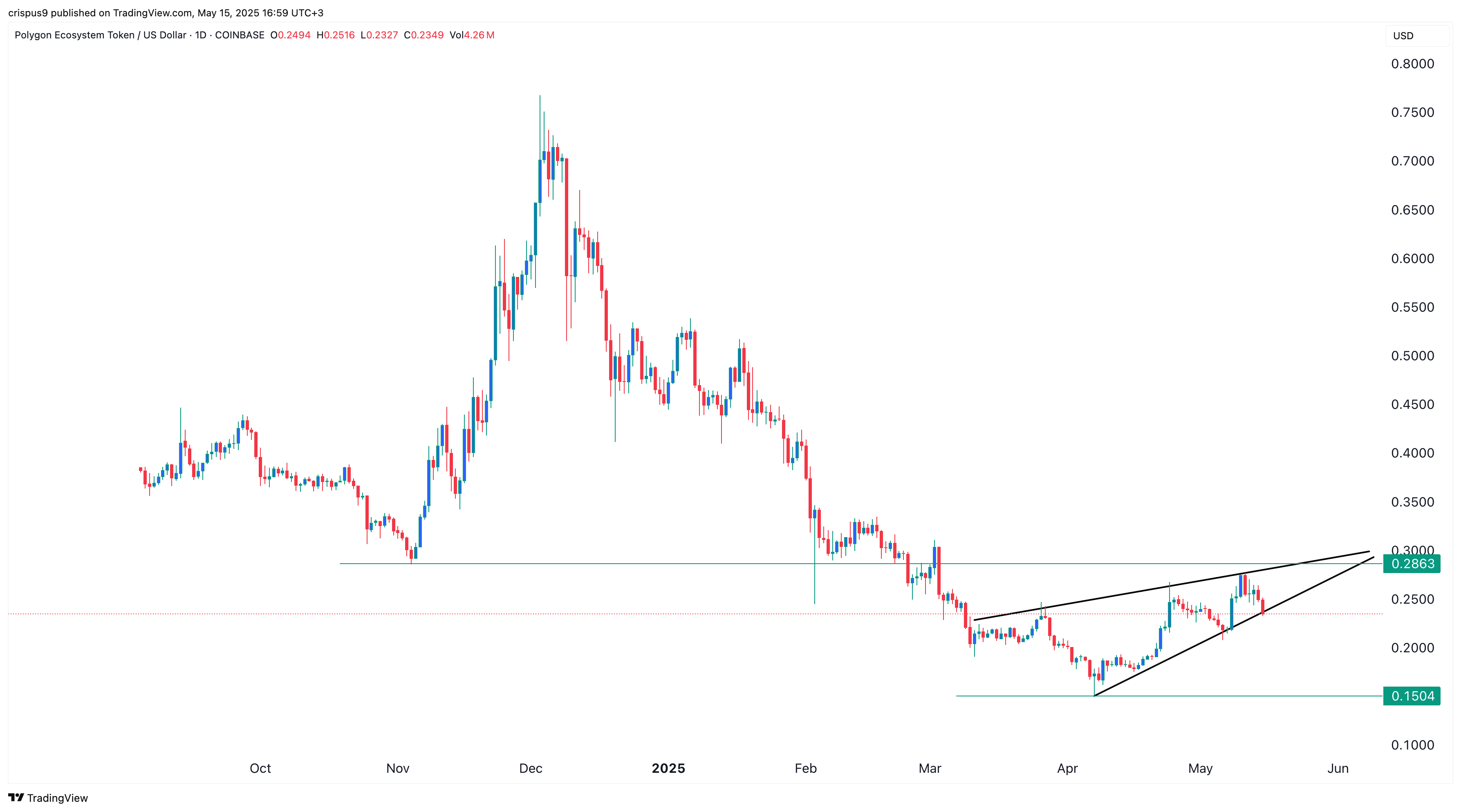 日线图显示,POL在4月份触底0.1500美元,随后随着整个加密货币市场的反弹而回升。该代币几乎重新测试了0.2863美元的关键阻力位,这是去年11月的最低水平。