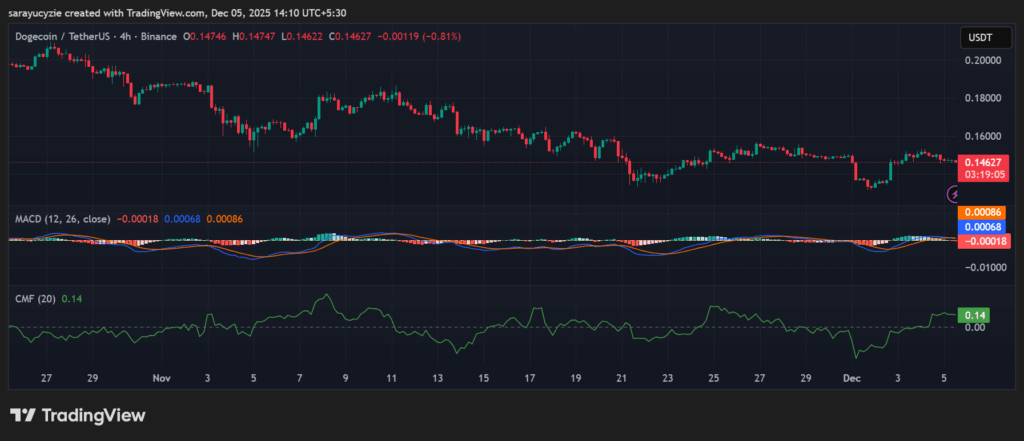 佳庆资金流量指标(CMF)目前位于0.14,暗示狗狗币市场存在健康的买盘压力。资金持续流入该资产,显示市场正在进行活跃的筹码收集,情绪倾向偏多。
